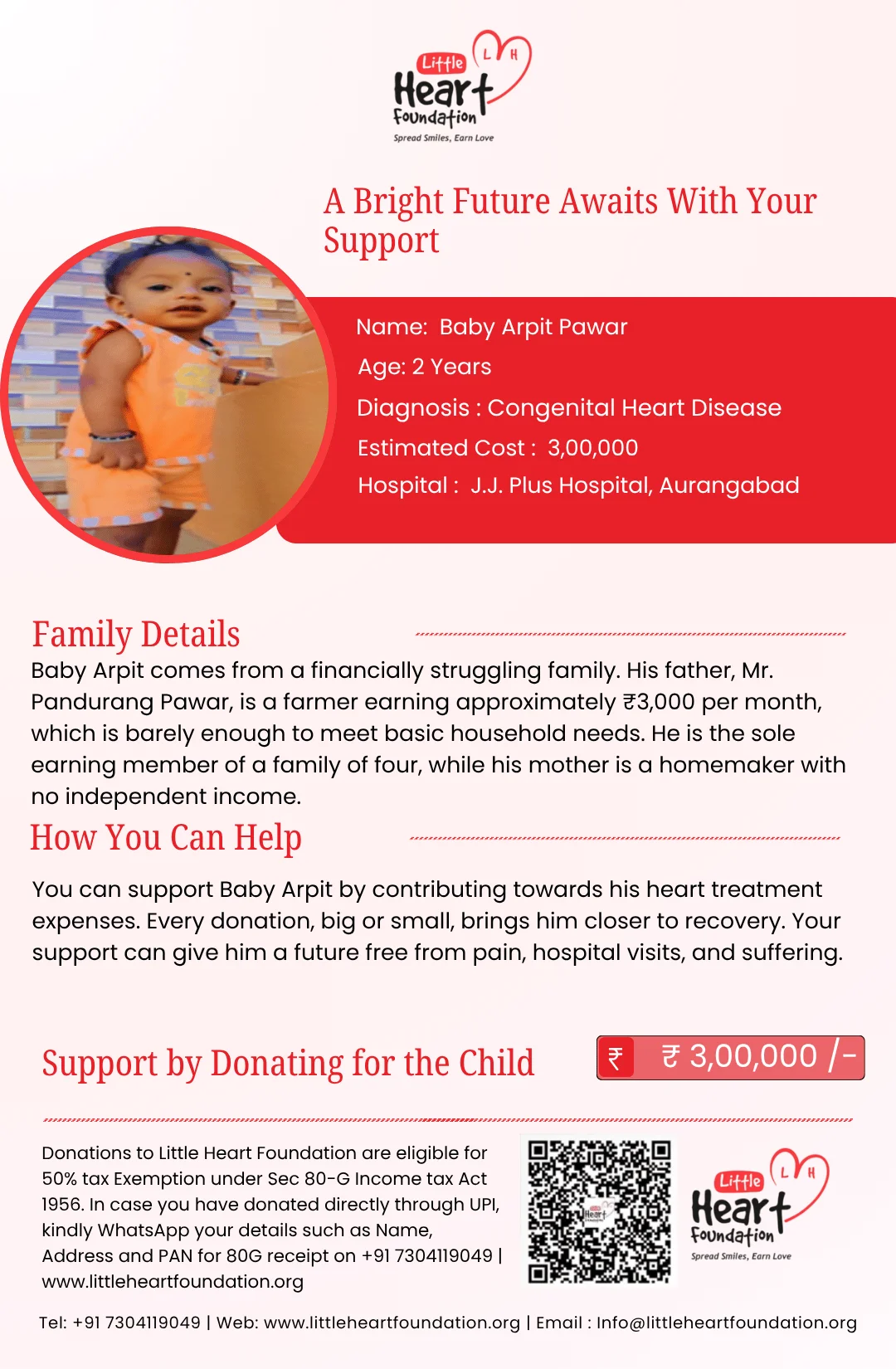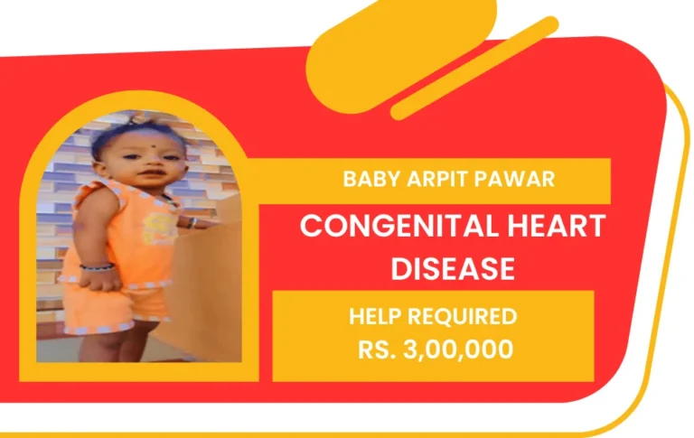 Baby Arpit Pawar is a 2-year-old male child diagnosed with Congenital Heart Disease, a serious heart condition that requires immediate medical intervention. Doctors have advised that he urgently needs TOF (Tetralogy of Fallot) Repair surgery, which is critical for correcting his heart condition and ensuring proper blood circulation.
