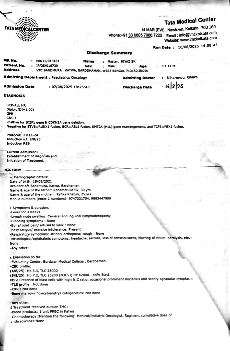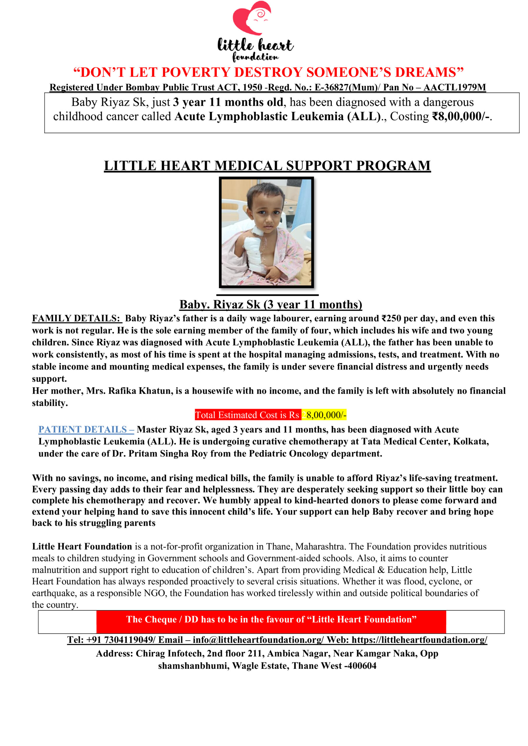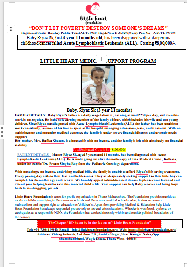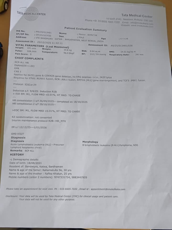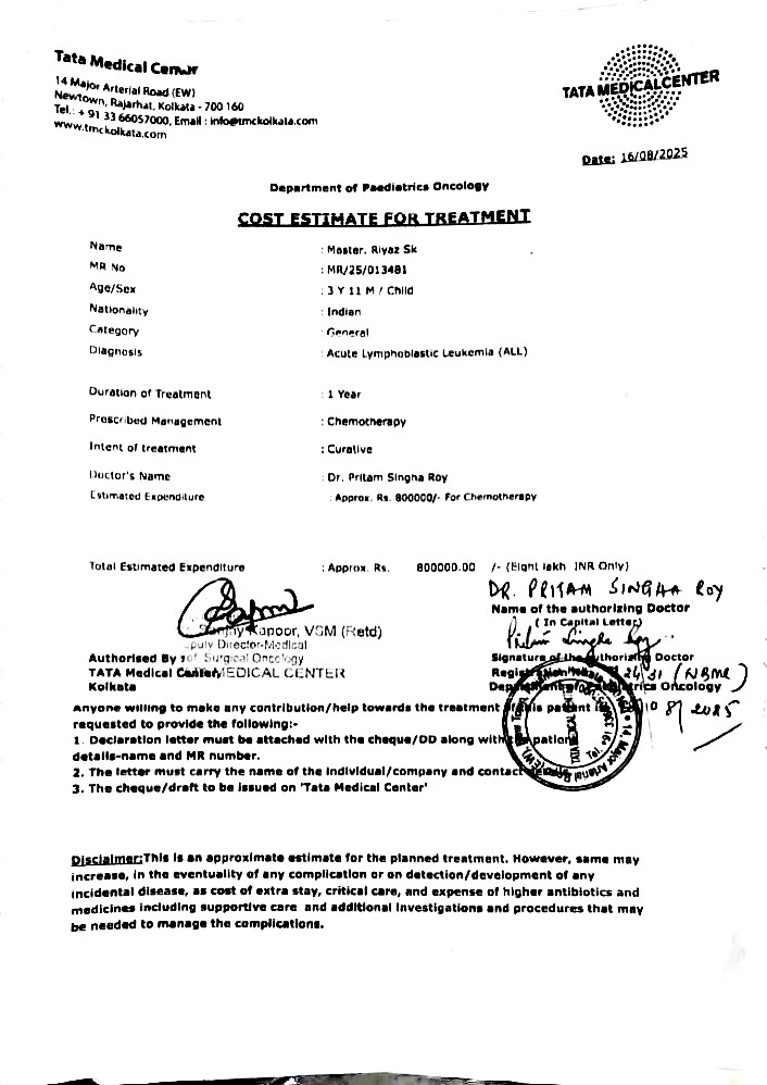 Baby Riyaz Sk, a 3-year-11-month-old child from Bandhmura, Katwa-I, Purba Bardhaman, West Bengal, has been diagnosed with Acute Lymphoblastic Leukemia (ALL), a severe and aggressive form of childhood blood cancer. His diagnosis was confirmed after weeks of persistent fever, extreme weakness, lymph node swelling, and abnormal blood reports. Medical investigations revealed high blast cells, low hemoglobin, and critical blood abnormalities requiring immediate intervention. Riyaz has been admitted to the Department of Pediatric Oncology at Tata Medical Center, Kolkata, where he is under the supervision of Dr. Pritam Singha Roy. Doctors have advised a one-year chemotherapy protocol (ICiCLE-24) with curative intent. This treatment is intensive and involves repeated hospital admissions, chemotherapy cycles, blood transfusions, diagnostic tests, and close monitoring to prevent life-threatening complications. Without uninterrupted treatment, Riyaz’s condition can deteriorate rapidly, putting his life at serious risk.